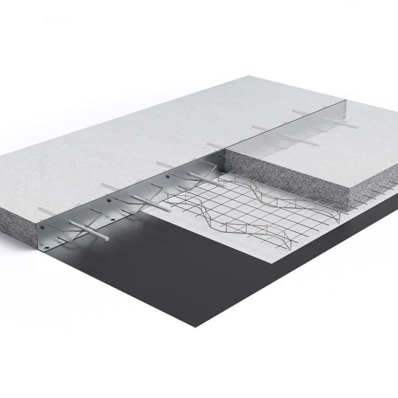 Il Giunto di Costruzione tipo E Isoplam è caratterizzato da lamiere accoppiate e pettini ondulati superiori che garantiscono un trasferimento efficace dei carichi tra lastre di calcestruzzo adiacenti. Le barre romboidali e le zanche integrate assicurano un perfetto ancoraggio al getto e prevengono cedimenti o disallineamenti del pavimento.