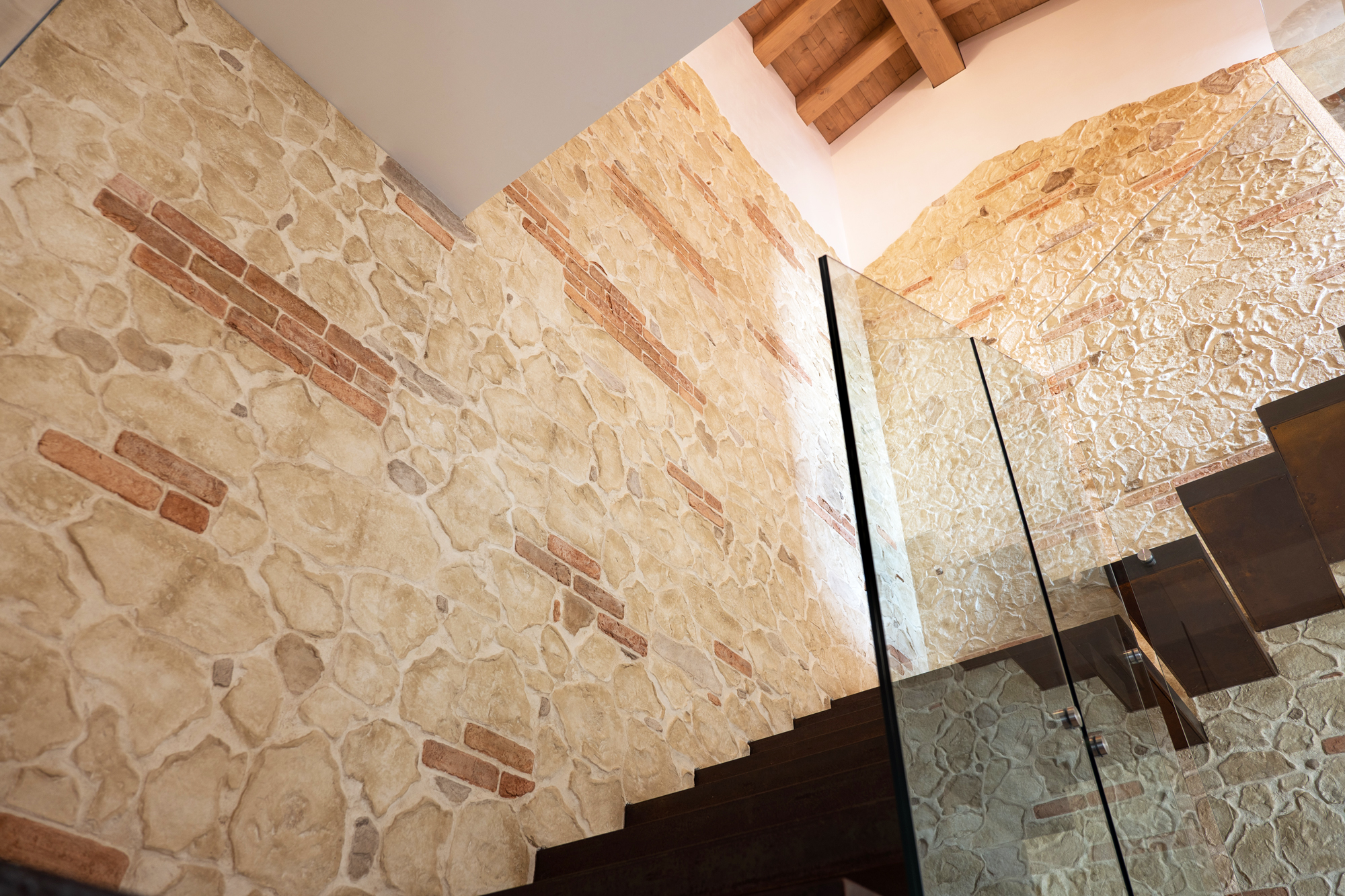 Dal mattone a vista all’effetto pietra scolpita, ogni soluzione è studiata per valorizzare gli ambienti, con continuità tra elementi verticali e orizzontali.