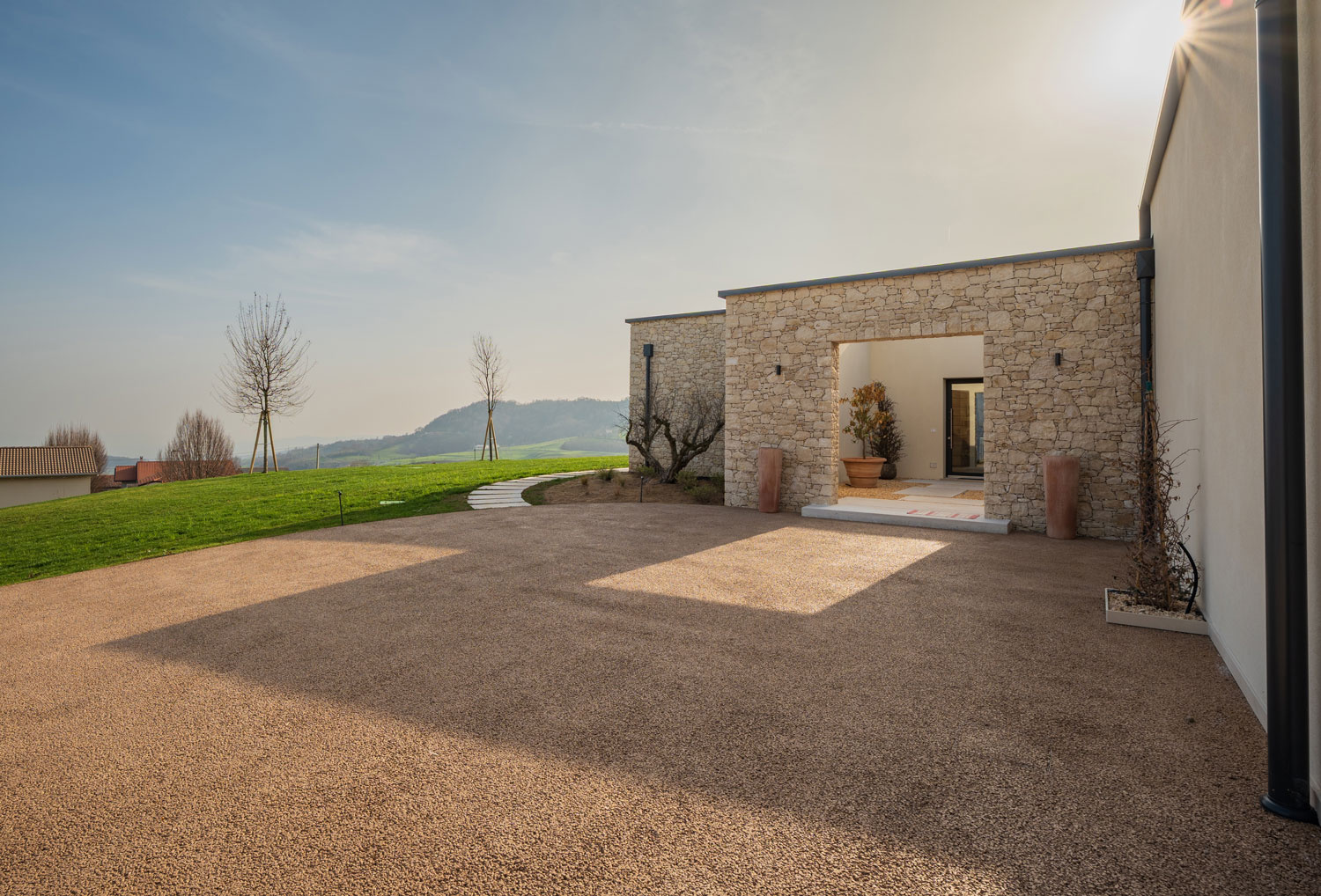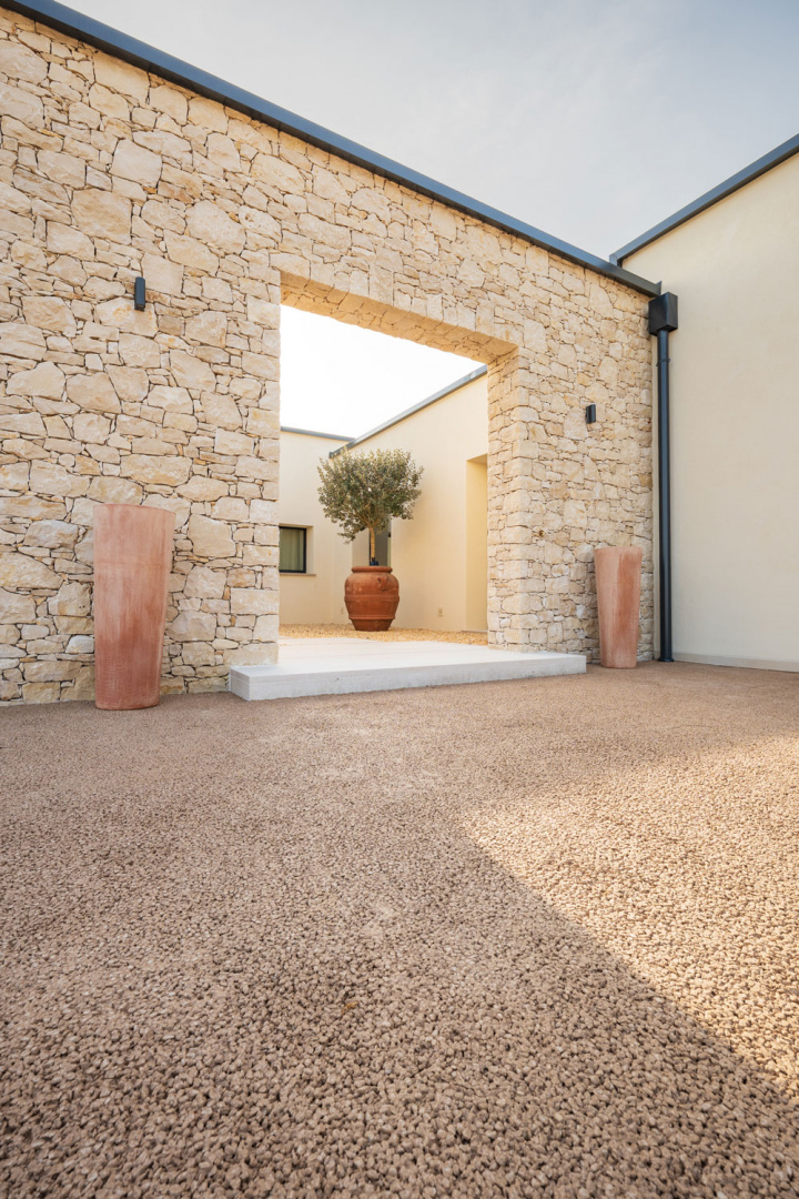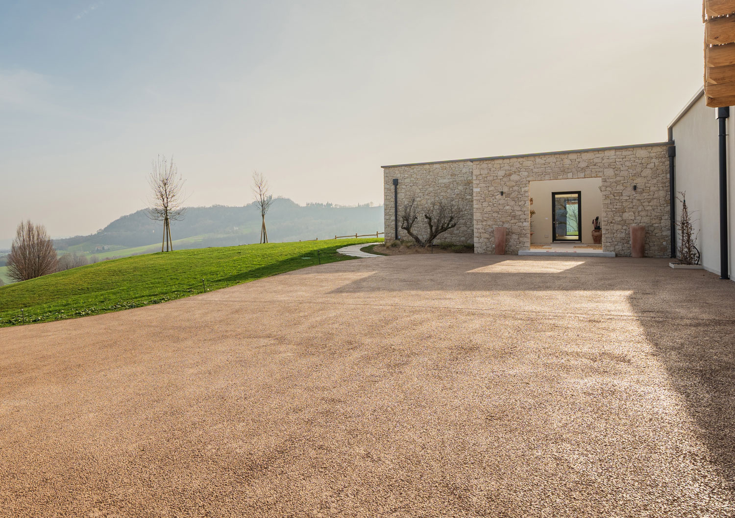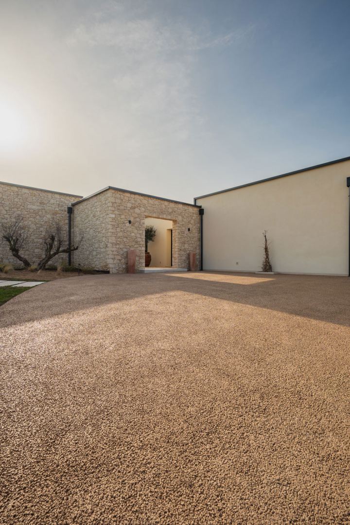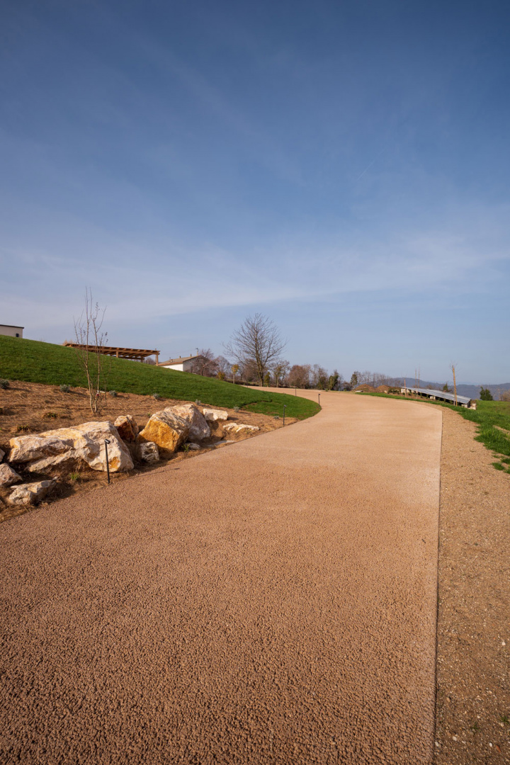 Realizzazione: per la pavimentazione delle aree esterne di una villa con piscina immersa nei colli vicentini è stato scelto Plam Cem Drain Isoplam®, il cemento drenante che consente la gestione naturale delle acque meteoriche, evitando ristagni e migliorando la permeabilità del suolo. La superficie continua, realizzata nel colore Yellow, richiama le tonalità della terra e si armonizza con il verde circostante, mantenendo un aspetto materico e naturale anche nelle zone carrabili e negli accessi.