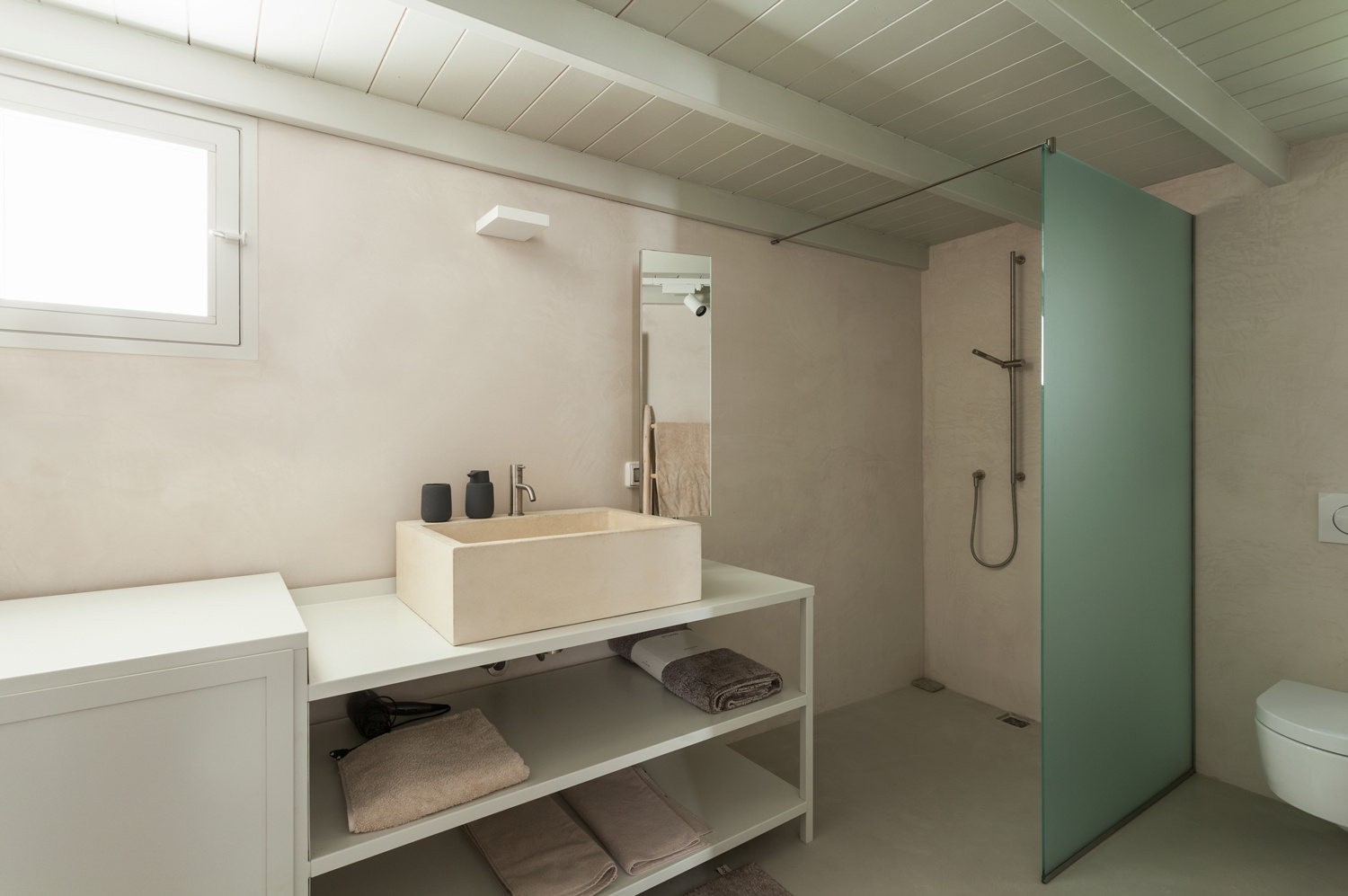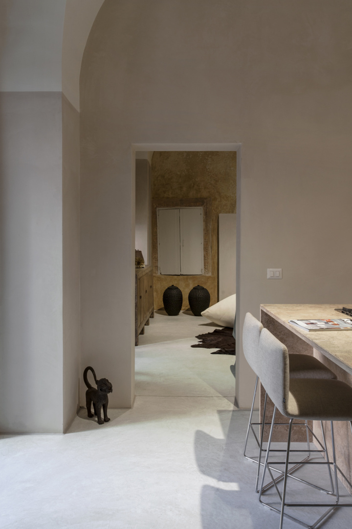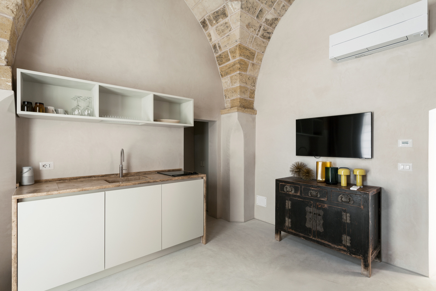 Nel progetto degli interni, la scelta della pavimentazione in Deco Nuvolato rappresenta il fulcro materico di tutta la villa. L’utilizzo di questa finitura continua — senza interruzioni visive tra cucina, living, camere e disimpegni — crea un flusso spaziale omogeneo, conferendo ampiezza e uniformità. La sua finitura opaca valorizza la luce naturale filtrata dalle aperture del centro storico e si armonizza con una palette cromatica sobria e raffinata, contribuendo a una percezione di eleganza discreta.