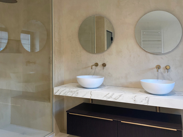 Micro Velvet, inoltre, permette di creare texture in verticale e portare il cemento nella terza dimensione, grazie alla sua flessibilità e agli attrezzi decorativi Isoplam. Il rivestimento dimostra come la creatività e la versatilità delle superfici in cemento trasformino gli ambienti indoor, regalando una continuità visiva di forte impatto scultoreo, che si estende dal pavimento fino ai complementi d’arredo.
