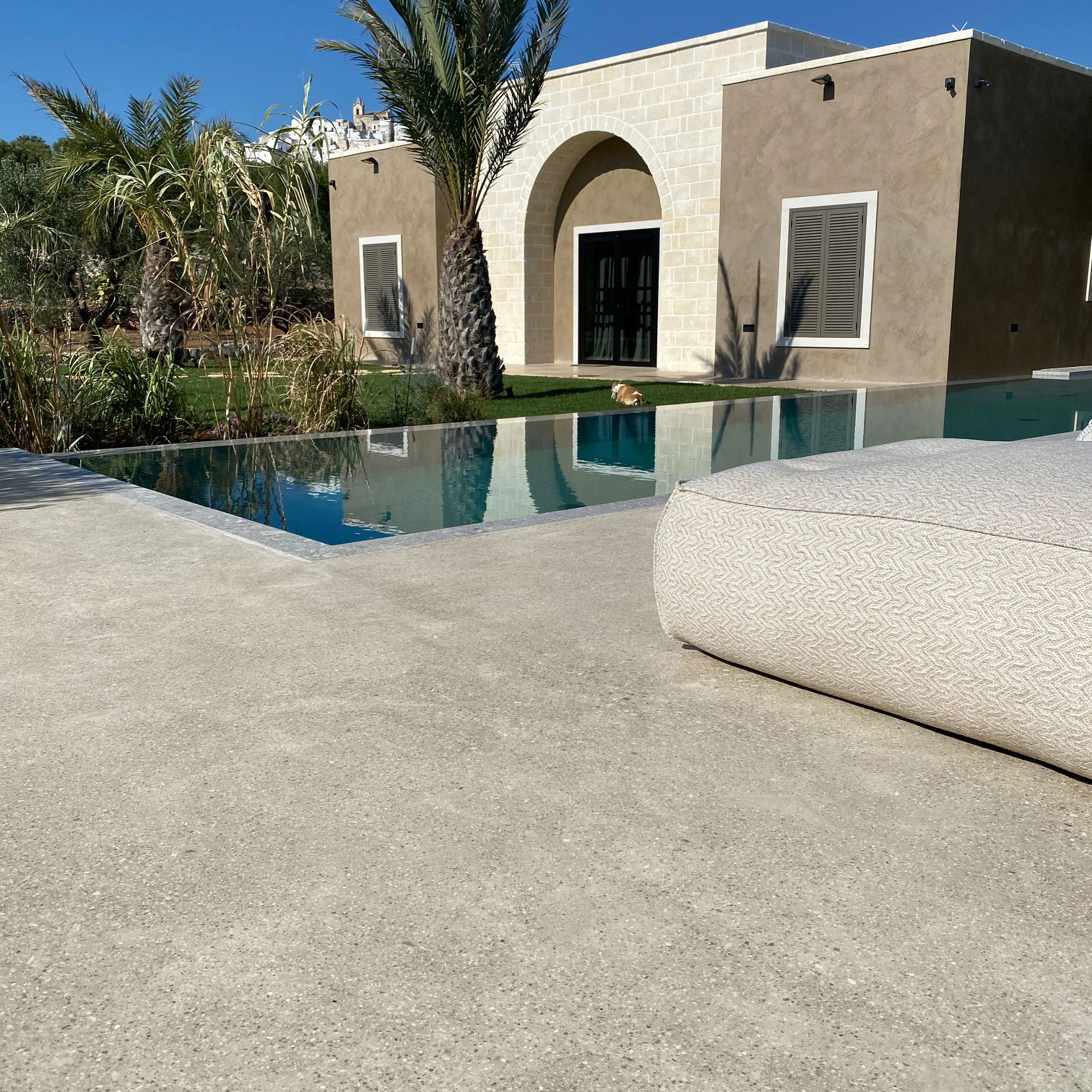 Skygrip è la soluzione cementizia ideale per pavimentazioni outdoor antiscivolo ad alte prestazioni. La finitura materica e la forte espressività visiva lo rendono particolarmente adatto a contesti dove estetica e sicurezza devono coesistere. Grazie alla bassa inerzia termica e a un SRI >49, Skygrip riduce l’accumulo di calore superficiale, garantendo una camminabilità confortevole anche a piedi nudi: una caratteristica essenziale per spazi costantemente esposti al sole come bordi piscina o terrazze urbane.