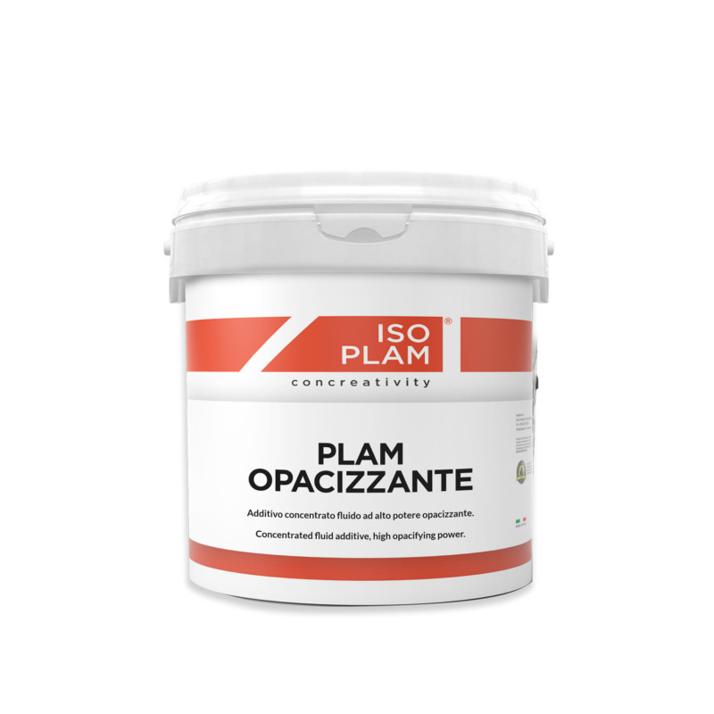 Plam Opacizzante Isoplam è uno speciale additivo concentrato fluido ad alto potere opacizzante e leggermente addensante, appositamente studiato per ottenere un uniforme effetto satinato o opaco.