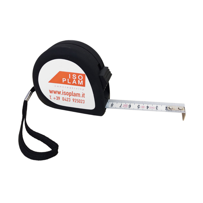 Il metro a nastro in acciaio flessibile ha una lunghezza di 5 metri, garantendo buona precisione e facilità di utilizzo nelle operazioni quotidiane. La scocca è personalizzata con logo Isoplam.