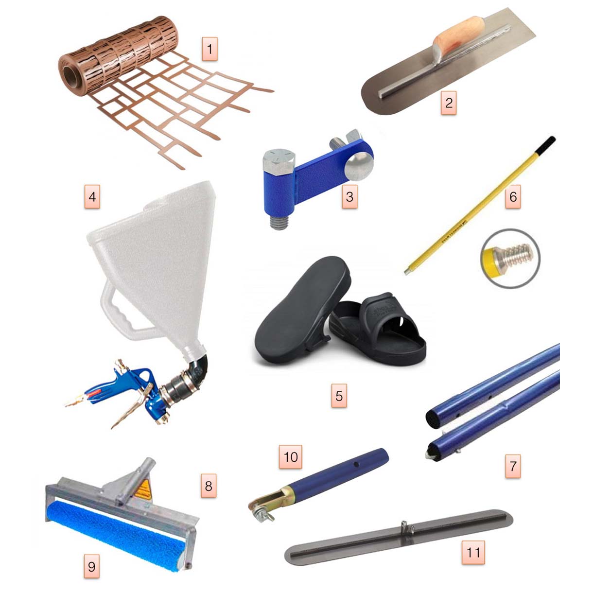 Il kit integra attrezzi specifici per garantire una corretta adesione dello stencil al calcestruzzo fresco, una distribuzione uniforme del materiale e una finitura omogenea e controllata. L’utilizzo coordinato degli strumenti consente di ottenere superfici decorative precise nei dettagli, con texture antiscivolo e disegni ben definiti, riducendo errori applicativi e tempi di lavorazione in cantiere.