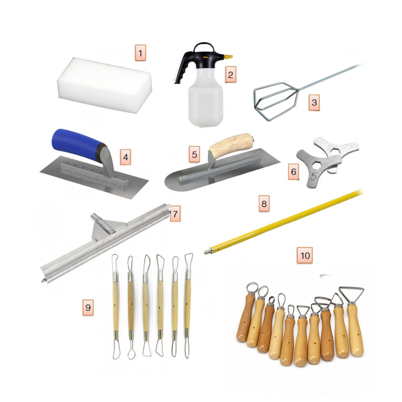 Il kit comprende gli strumenti fondamentali per tutte le fasi operative: preparazione dell’impasto, applicazione della malta a spessore controllato, modellazione della superficie e successiva finitura. Il miscelatore per malte consente di ottenere un impasto omogeneo e lavorabile, indispensabile per materiali ad alta viscosità. La racla regolabile con adattatori di spessore permette di distribuire il prodotto in modo uniforme, mentre cazzuole e frattazzi professionali assicurano una corretta compattazione e sagomatura del materiale.