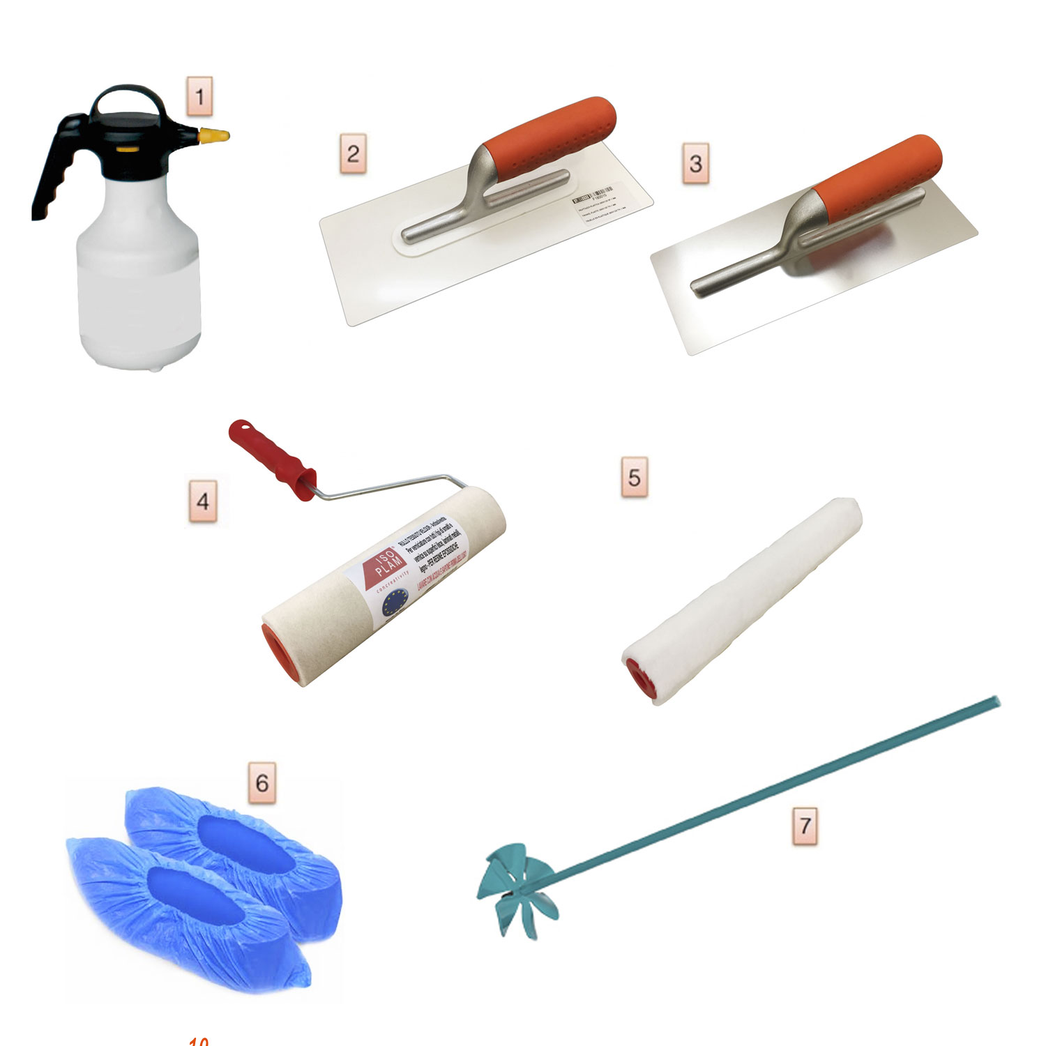 Il set si completa con la frusta per miscelare prodotti a bassa viscosità, così da ottenere impasti omogenei e pronti all’applicazione, e con copriscarpe monouso in omaggio per proteggere le superfici decorative non ancora protette.
