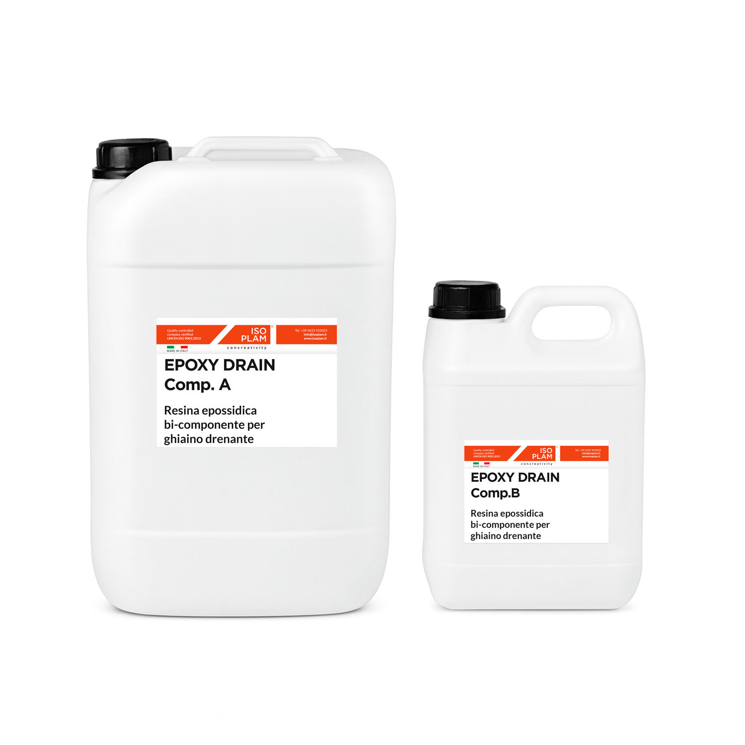 Epoxy Drain Isoplam è una resina epossidica bicomponente fluida e priva di solventi, specifica per la realizzazione di pavimentazioni drenanti architettoniche. Miscelata con Ciottolo Drenante Isoplam o con graniglie naturali lavate ed essiccate, dà vita a rivestimenti monolitici resistenti, compatti e di grande valore estetico. Il sistema Plam Resin Drain Isoplam, di cui Epoxy Drain è il legante principale, unisce performance tecniche e libertà compositiva, permettendo di creare superfici continue ad alto impatto visivo, facili da pulire e resistenti agli agenti atmosferici e all’usura.