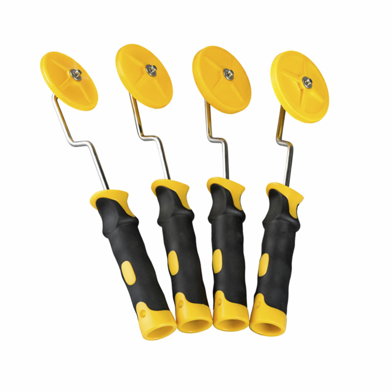 Le rotelle segnagiunto in gomma sono disponibili in diverse larghezze e texture: arrotondate, a punta a V, piatte lisce, ruvide effetto sabbiato. I rullini segnafuga possono essere impiegati anche per il ritocco dell’intonaco stampato e, più in generale, su superffici in malta e stucco, consentendo una definizione precisa del disegno. La rotella è leggera e maneggevole ed è dotata di una testa flessibile che segue con naturalezza le linee del motivo stampato. Il manico ergonomico in gomma presenta un incavo studiato per l’appoggio del dito indice, permettendo un controllo accurato della pressione e garantendo linee pulite e regolari.