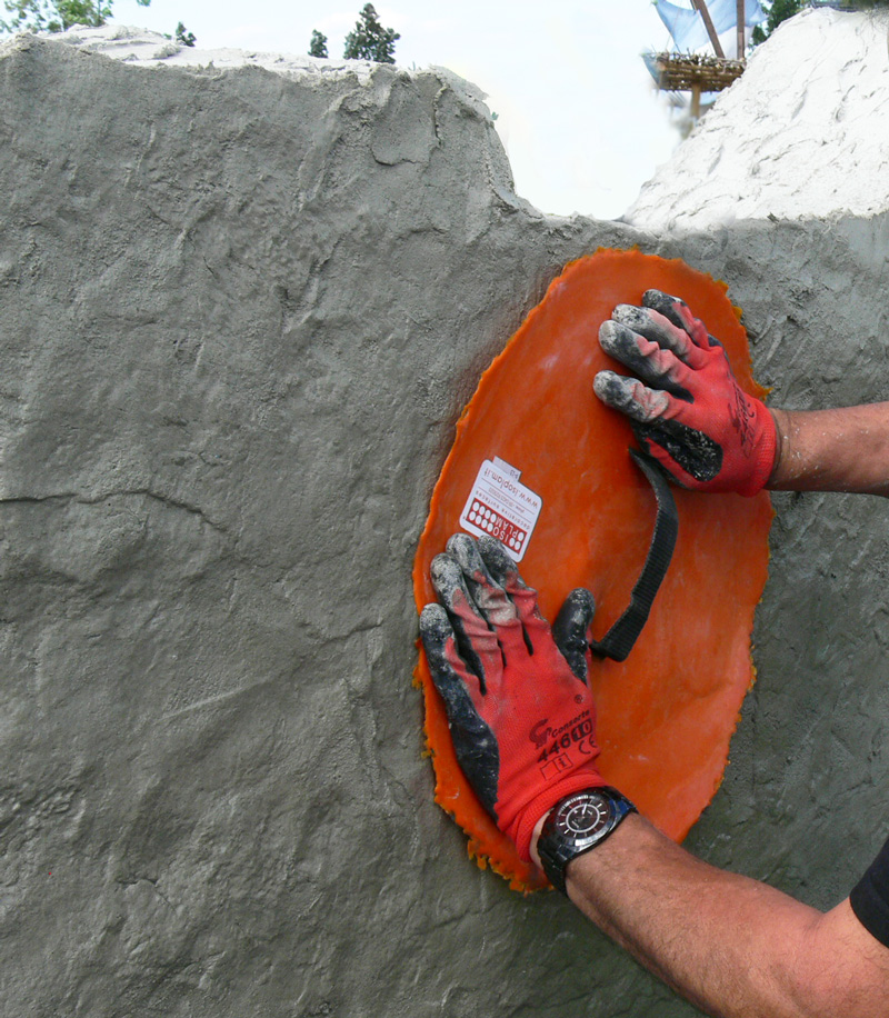 Gli elementi possono essere ruotati e sovrapposti per ottenere combinazioni di disegno sempre diverse. Lo spessore ridotto e la presenza di una maniglia integrata rendono lo stampo leggero e facilmente maneggevole. Grazie a queste caratteristiche, Roccia Piccola viene impiegato anche per lo stampaggio di intonaci e superfici verticali, risultando adatto alla realizzazione di muri stampati e dettagli decorativi coordinati alla pavimentazione.