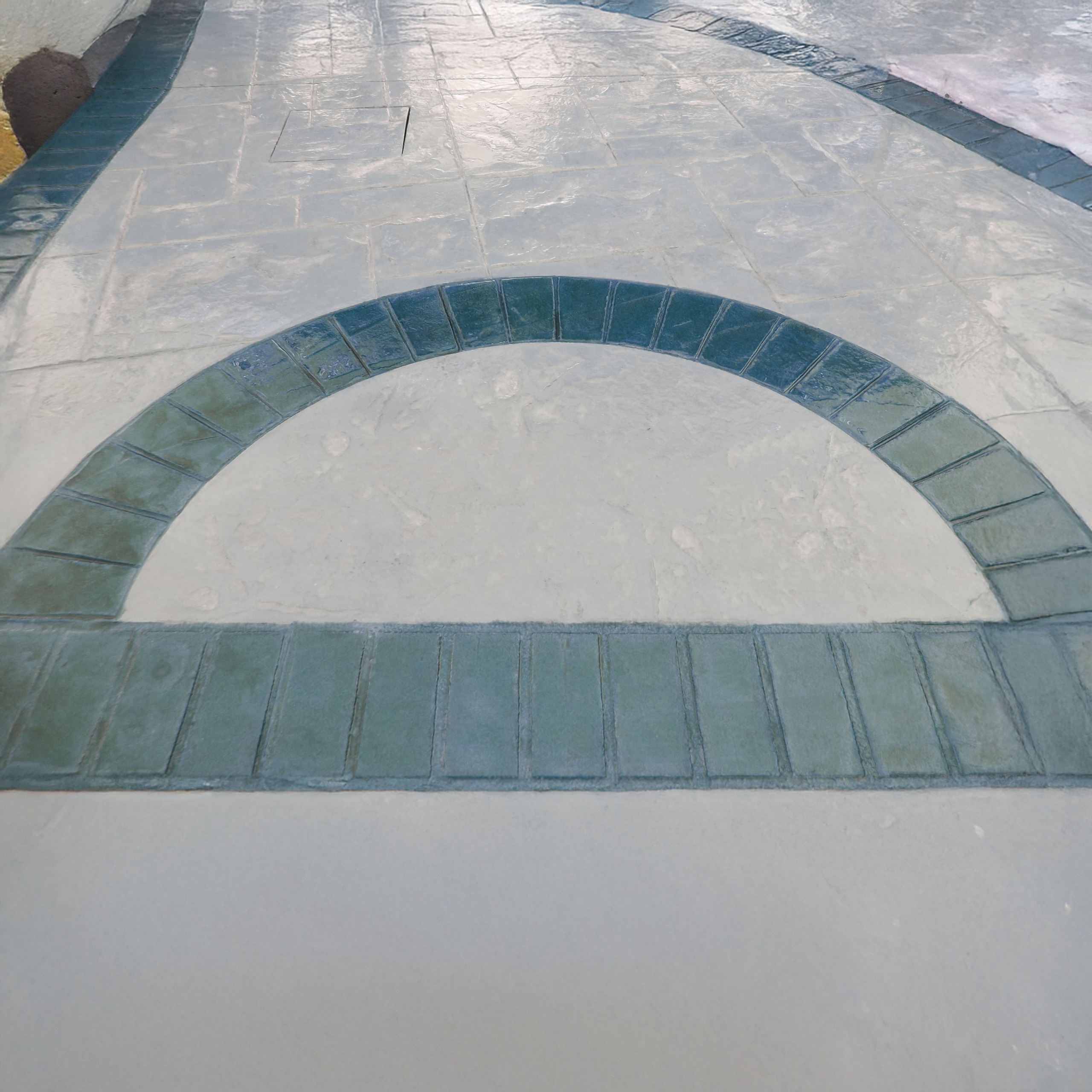 La Greca Boston Isoplam è uno stencil decorativo progettato per la realizzazione di bordure curve e circolari nei pavimenti in cemento stampato, caratterizzato da una sequenza di tredici mattoni rettangolari di misura uniforme, disposti verticalmente lungo una curvatura molto stretta. Il disegno, fortemente curvilineo, è definito da fughe regolari, sottili e poco incisive e da una texture omogenea, che conferisce alla greca un aspetto ordinato e controllato anche su raggi ridotti.