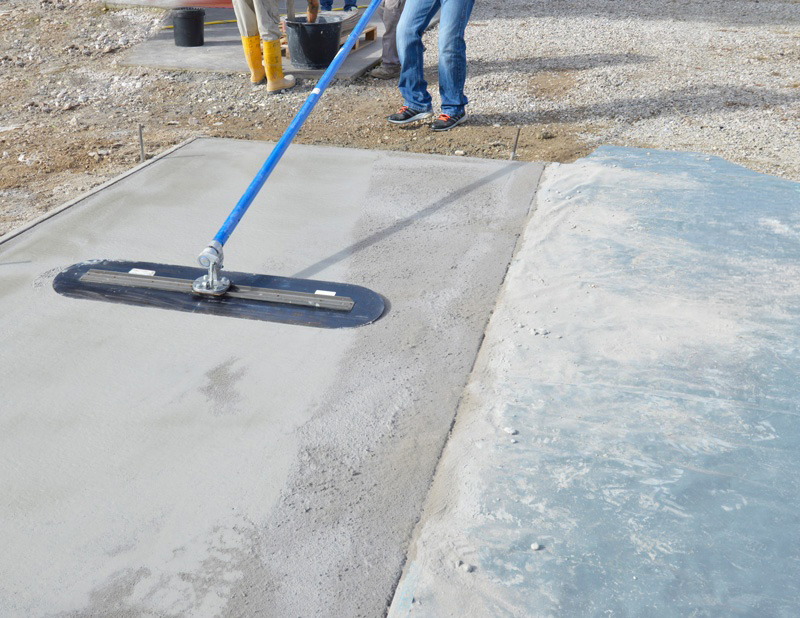 La cazzuola gigante trova anche impiego per rifinire superfici in cemento industriale spolverate al quarzo o in ghiaino lavato prima dell’applicazione del disattivatore superficiale. La lama flessibile ha le estremità arrotondate per non creare segni di sovrapposizione durante la lavorazione.