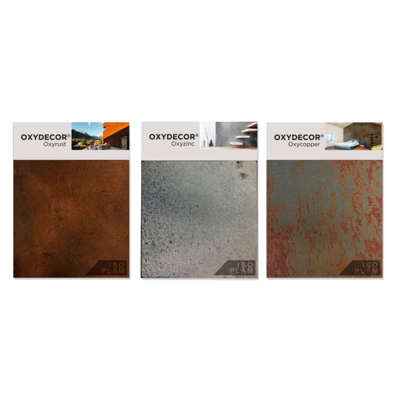 I campioni Oxydecor sono tavolette dimostrative realizzate su supporto Forex ad alta resistenza che presentano il rivestimento reale dei sistemi Oxydecor nelle tre finiture: effetto ruggine, zinco e rame.