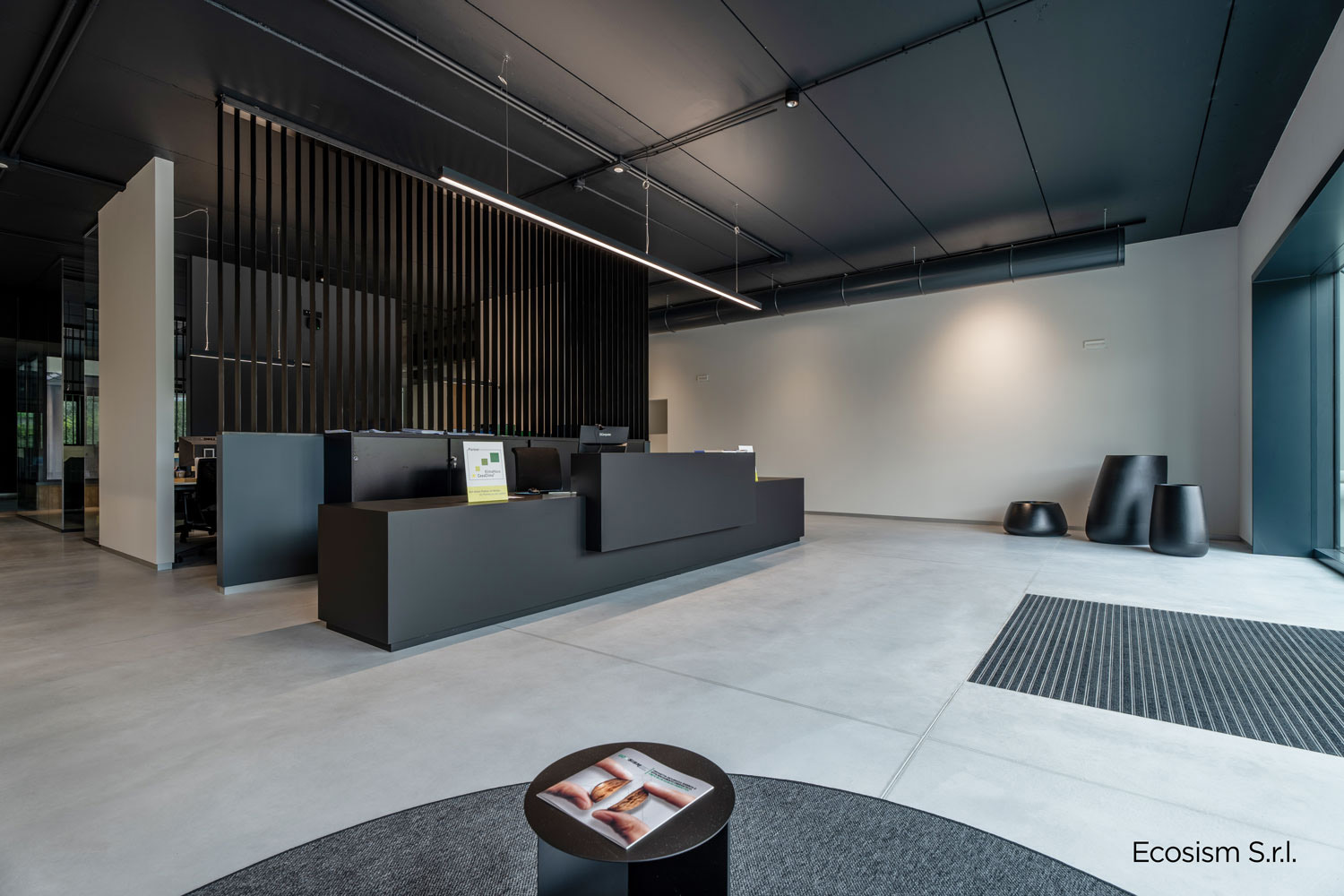 Il progetto degli interni si basa su un linguaggio essenziale e contemporaneo, costruito attraverso pochi materiali e una palette cromatica mirata a trasmettere solidità, tecnologia e rigore progettuale. Gli ambienti sono caratterizzati da un’estetica industrial contemporanea, con impianti e dettagli tecnici a vista, strutture metalliche, superfici vetrate e arredi dalle linee pulite.