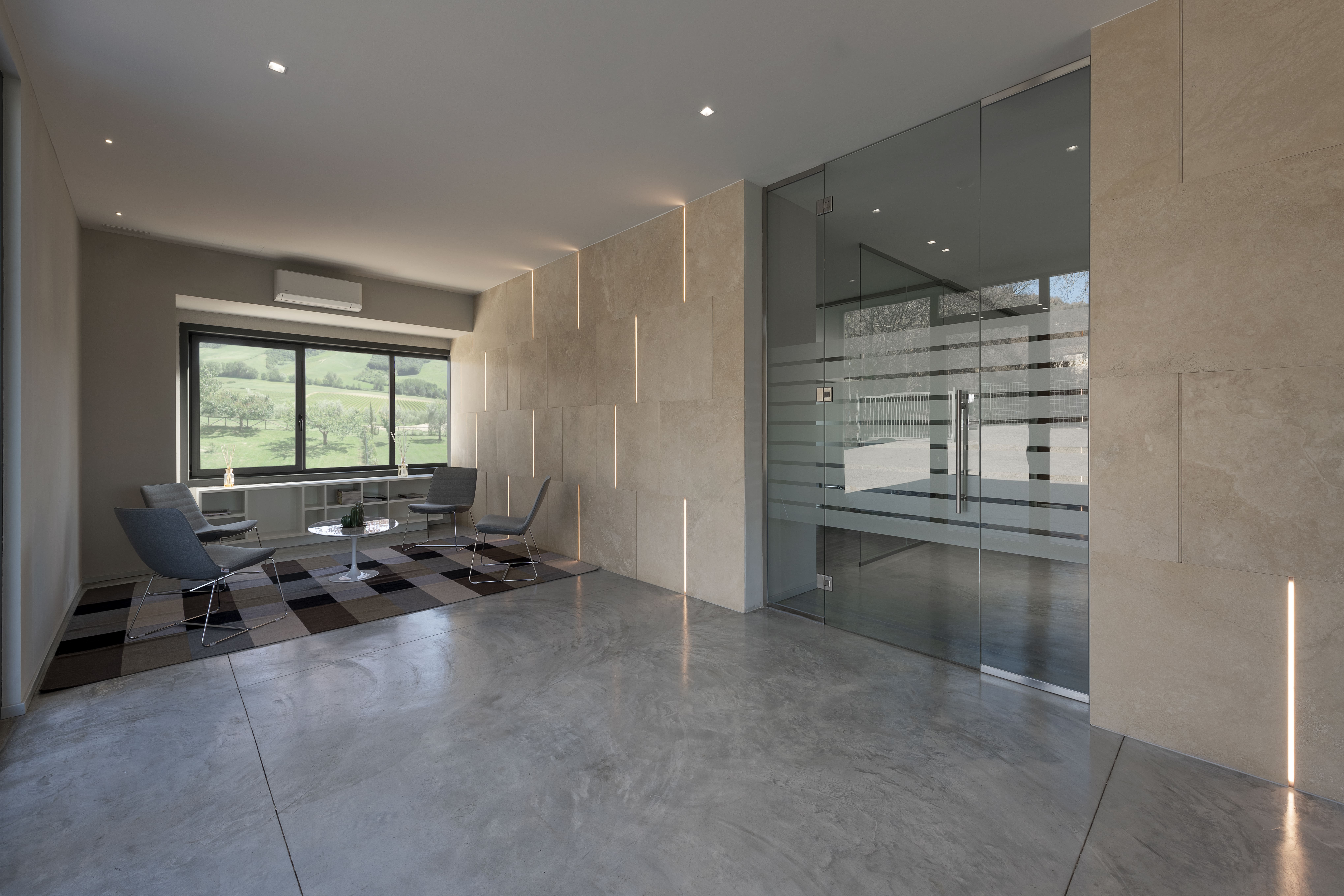 La parete d’ingresso, rivestita con lastre di travertino intervallate da sottili strisce LED, crea un effetto scenografico e sobrio che valorizza l’ingresso e stabilisce il tono materico per tutto il progetto. Grazie alla pavimentazione Deco Nuvolato, si ottiene una superficie continua, priva di fughe, che esalta la percezione di apertura e fluidità, ideale per un ambiente aziendale che vuole coniugare funzione operativa, accoglienza e identità visiva.