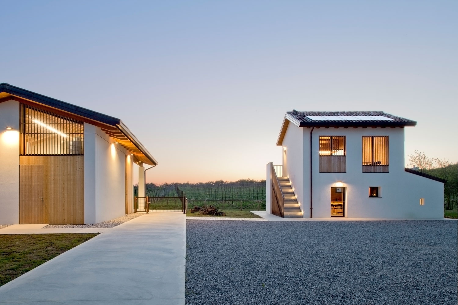 n questo dialogo tra passato e presente, la pavimentazione esterna in Deco Nuvolato Grip gioca un ruolo chiave, cucendo visivamente e funzionalmente le diverse anime del progetto: la stalla restaurata, oggi sala degustazione e spazio ricettivo, e la nuova cantina di vinificazione, affacciata sui filari.